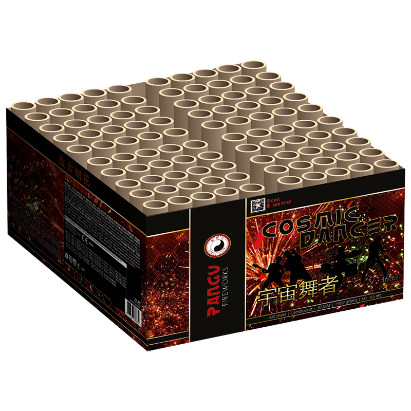 Cosmic Dancer is een 100 schots 30mm kaliber compound uit de Pangu Fireworks serie. Met zijn 100 schoten in het maximale kaliber zet hij zijn ultiem sierlijke en grote vuurwerkeffecten als een echte sierlijke danser neer. Deze danser is dan ook gespecialiseerd in glitter staarten, glitter palmen en flitsende moves. Gecombineerd met dikke gouden mines swingt hij van top tot teen!
