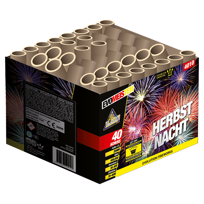 Herbstnacht, Maak u klaar voor een spectaculaire lichtshow! 40 schoten lang knalt deze absolute topper van een siercake de mooiste rode/gouden effecten de hemel in, om af te sluiten met een prachtige crackling burst! n nProductinformatie: nType product: Duits vuurwerk nEffect product: Cake nTube diameter: mix mm nFanshape: Ja nClassificatie: CAT.F2 nMinimale leeftijd: 16 jaar nLegaal afsteken op: 31 december nVeiligheidsafstand: minimaal 8 meter nGeschikt voor smalle straten: Nee nGeschikt in Gemeente vuurwerkverbod: Nee Herbstnacht 40 shots 25mm Goedkoop vuurwerk kopen bij Vuurwerkwinkel Almelo
