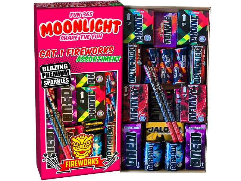 Moonlight nExtra groot pakket vol straatgenot, louter categorie 1 fun voor jong en oud! n nKruitgewicht 223 Gram nTube diameter – nBrandtijd – Seconden nHoogte – Moonlight Goedkoop vuurwerk kopen bij Vuurwerkwinkel Almelo