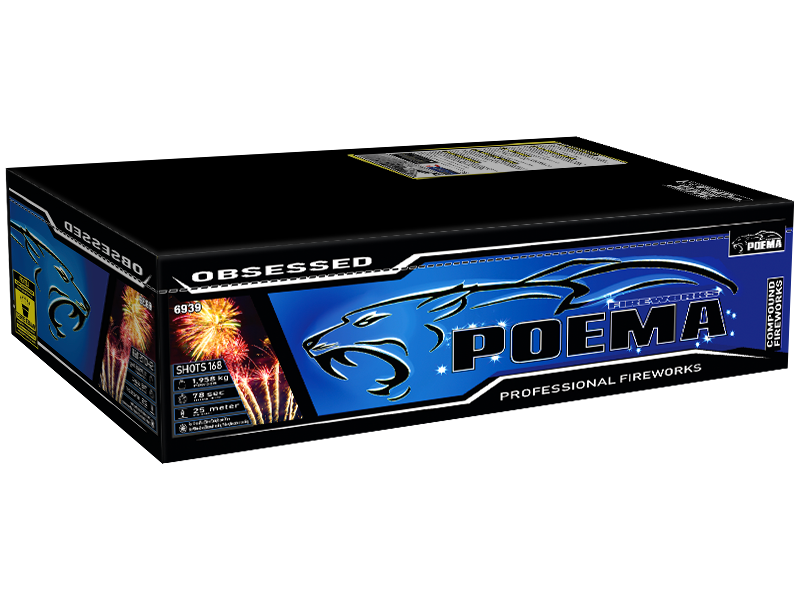 Obsessed nDe Obsessed is een mooie V-shape compound cake uit de nieuwe Poema serie met 168 shots! n nKruitgewicht 1658 Gram nTube diameter 25 / 30 nBrandtijd 78 Seconden nHoogte 30 m. – 35 m. Obsessed Goedkoop vuurwerk kopen bij Vuurwerkwinkel Almelo